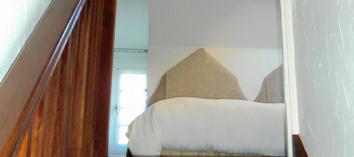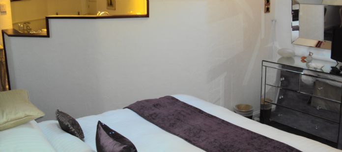 The bedroom upstairs has a super-king bed, a second television, skylights over the bed to stargaze at night, dormer windows and an open plan bathroom with long basin counter and free-standing bath.